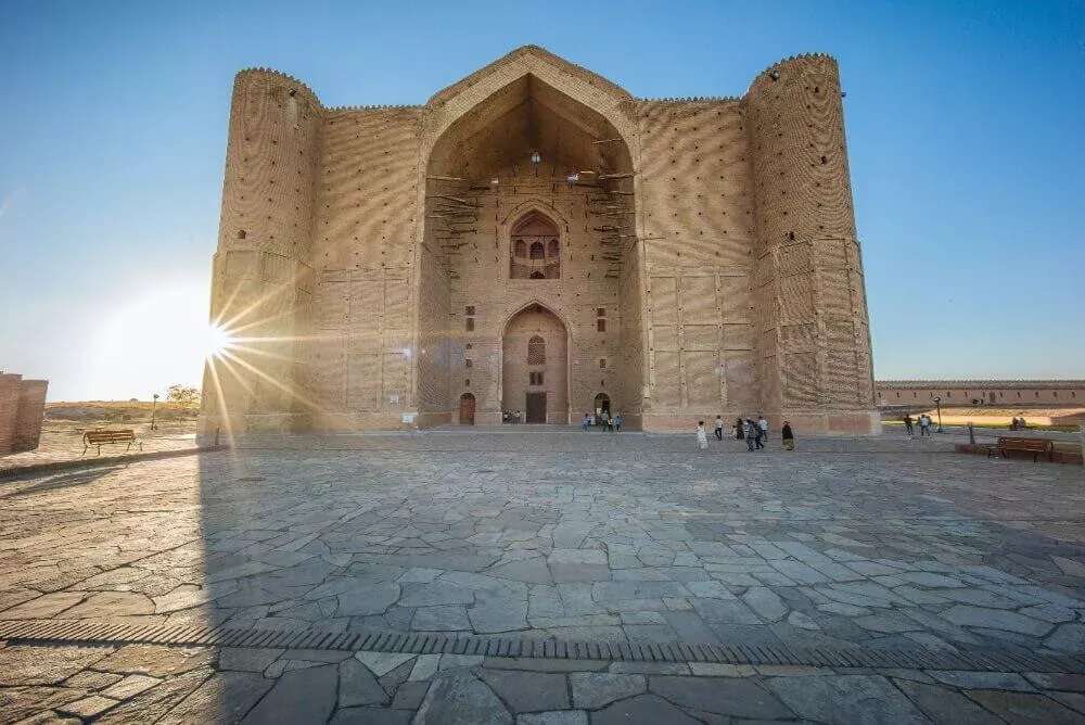 Construction of the mausoleum began in the XIV century. at the burial site of the world famous Sufist and Islamic poet Khoja Ahmed Yassavi, who died in 1166. The Mausoleum is truly beautiful and massive and erected by order of the founder of the Timurid Empire - the Great Timur, the construction is timed to the victory of the Great Timur over the ruler of the Golden Horde - Tokhtamysh. The shape of the mausoleum is rectangular with domes. The domes are erected in brickwork and are one of the largest in Central Asia.