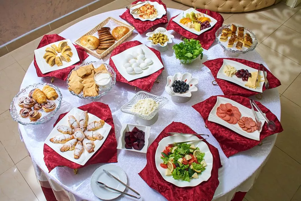 Для гостей отеля "Алтын-Казына" сервируется завтрак "шведский стол".