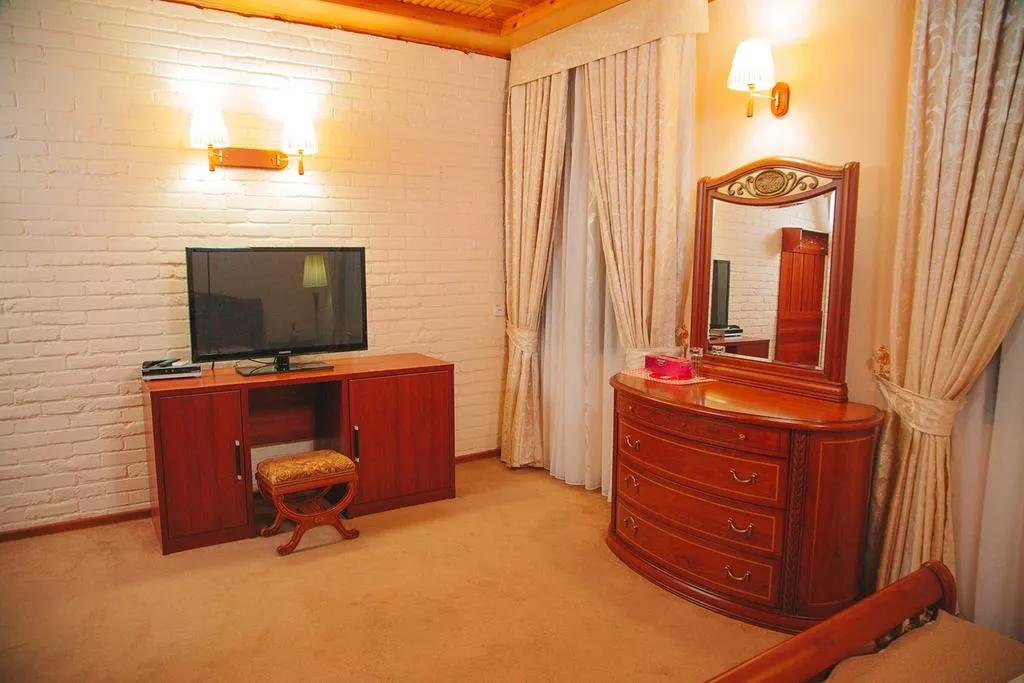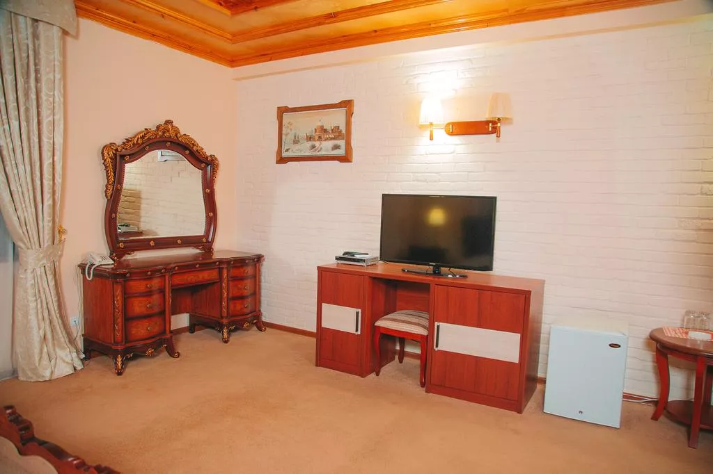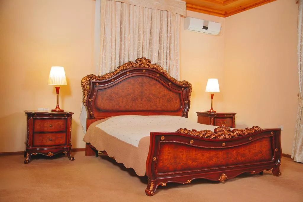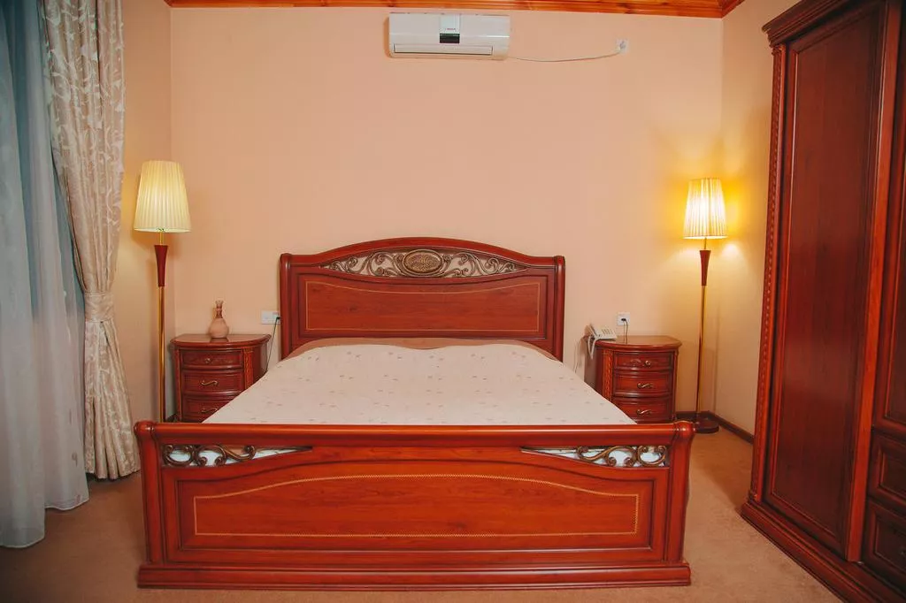 Элегантные номера с кондиционерами, оформленные в классическом стиле в бежевых тонах с мебелью из темного дерева, оснащены телевизором с плоским экраном, холодильником, а также собственной ванной комнатой с феном.