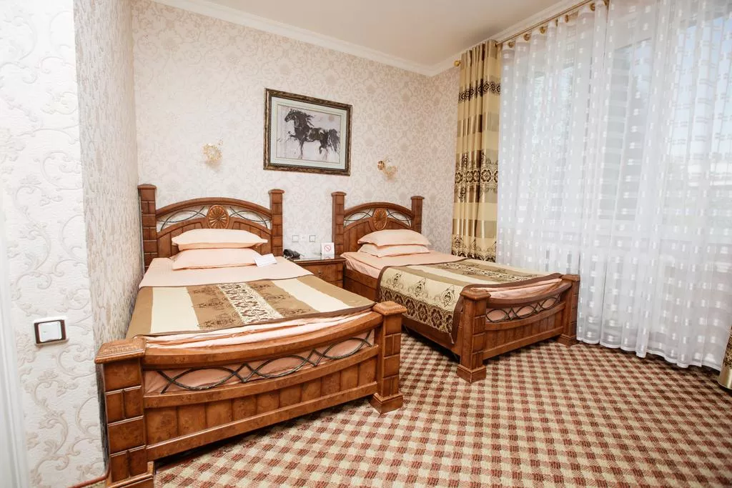 В Гостинице всего 127 стандартных номеров, из них: 2 люкса, 22 Dbl, 103 Twin. Каждый номер оснащён кондиционером, телевизором с плоским экраном, спутниковым ТВ с 11 каналами на 5-ти языках, прямым телефоном, мини-баром и ванной комнатой. Наши просторные комнаты, с высокими потолками и полные удобств, обязательно вам понравятся. Уютные номера с балконами открывают прекрасный вид на древние стены Ичан-калы.