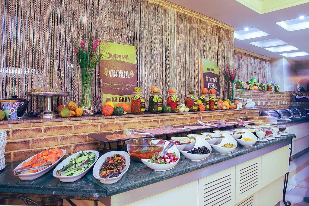Каждое утро в элегантном зале для завтраков отеля «Казжол» сервируют завтрак «шведский стол». В ресторане отеля подают разнообразные традиционные блюда алматинского региона, которые готовят из экологически чистых продуктов.
