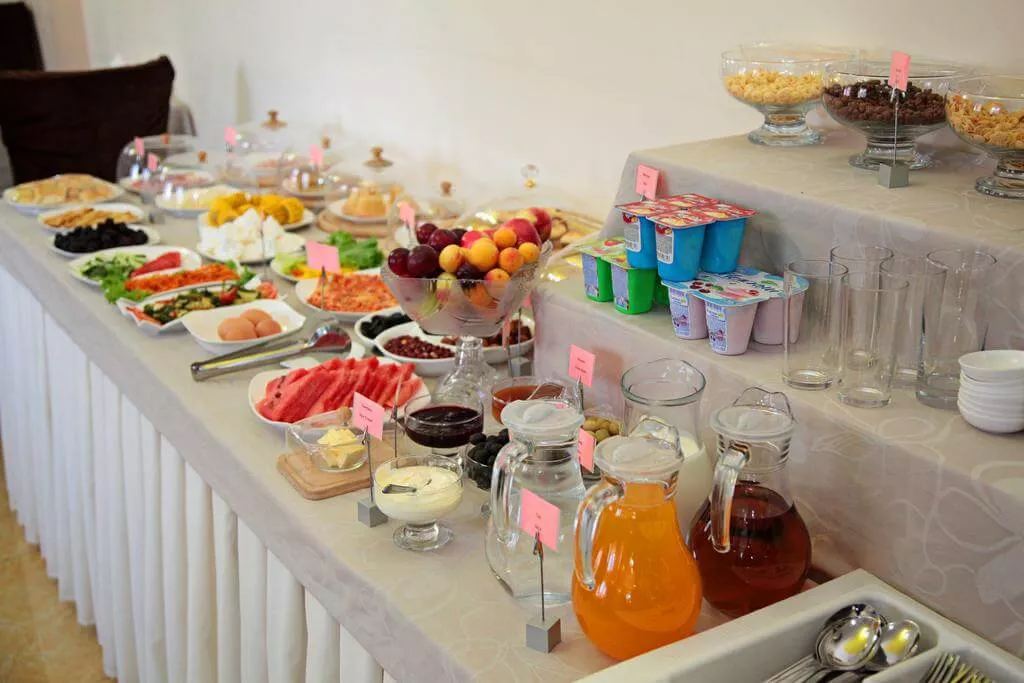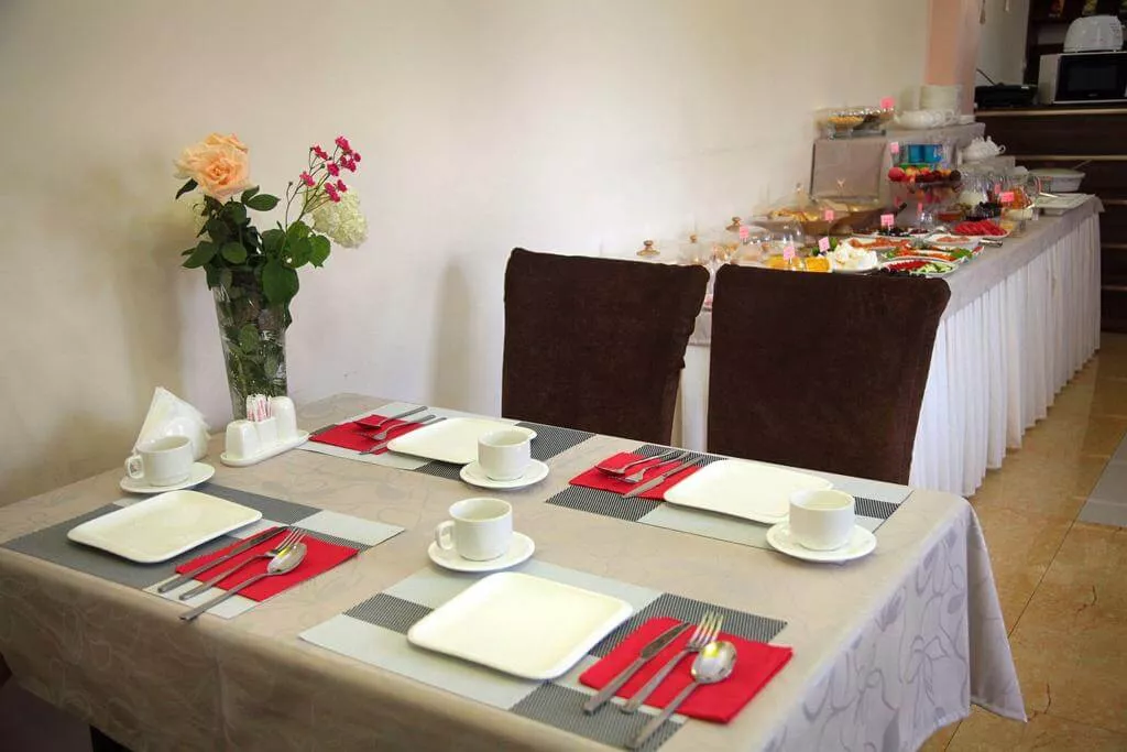В ресторане на территории отеля гостям предлагают различные блюда европейской и киргизской кухни. Каждое утро подают завтрак «шведский стол», а в баре можно заказать напитки.