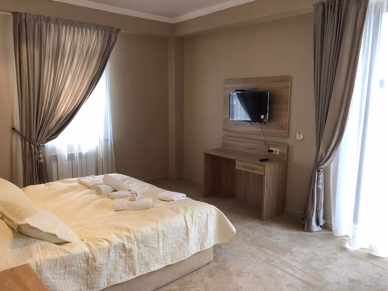 К услугам гостей отель предлагает более 100 уютных комфортабельных номеров и номера повышенной комфортности, соответствующие европейским стандартам, особая зона отеля – Президентский люкс!
