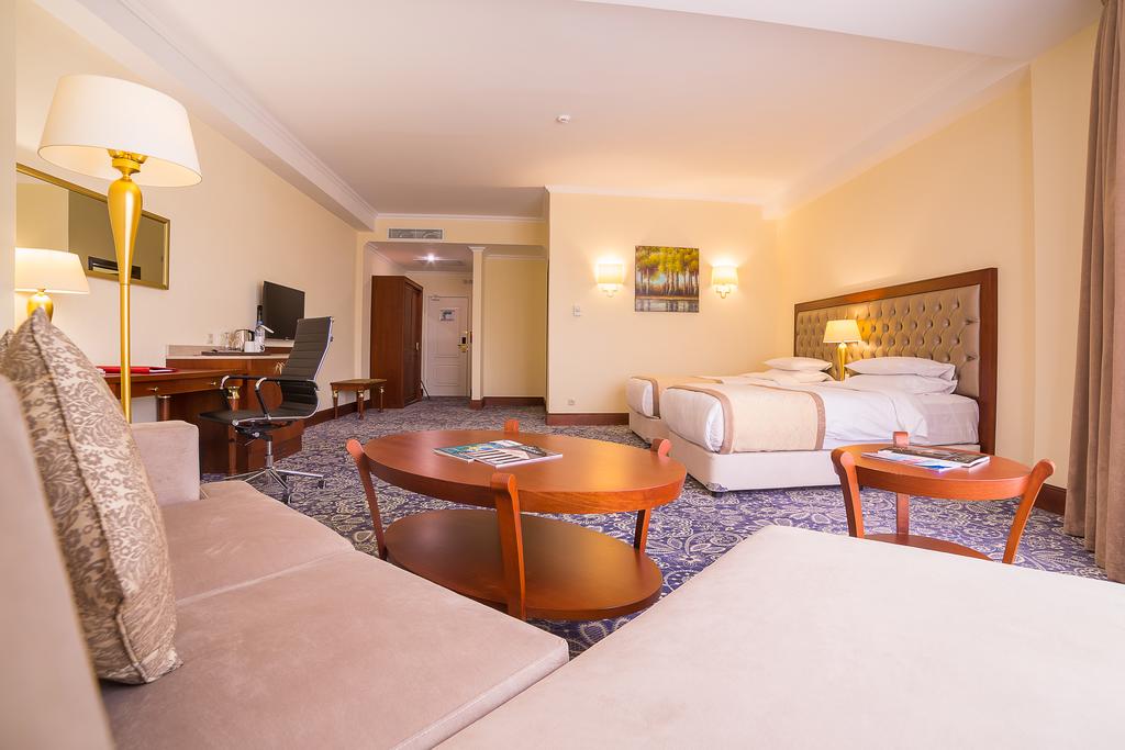 Все номера оснащены LED-телевизорами, эргономичной мебелью, мини-баром, сейфом и наборами для приготовления чая и кофе. В каждом номере к услугам гостей бесплатный высокоскоростной доступ в Интернет, ортопедические матраcы, спутниковое телевидение, система индивидуального климат-контроля и эргономичная мебель. В номерах Отеля Вы почувствуете комфорт и полноценный отдых. Это идеальное место для плодотворной работы или расслабляющего отдыха во время вашего пребывания в Алматы. К Вашим услугам номера для курящих и некурящих, а также, номера для людей с ограниченными возможностями.