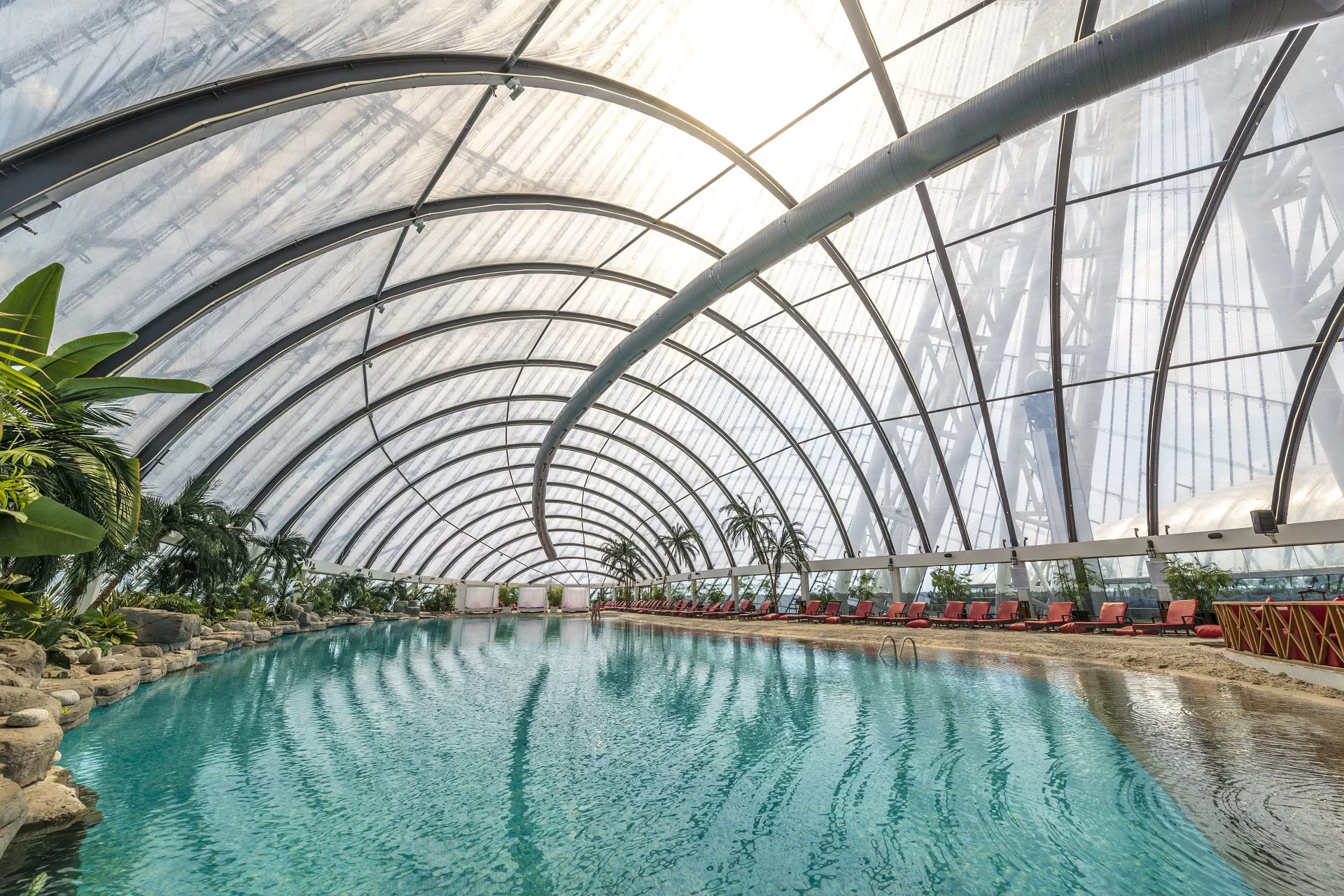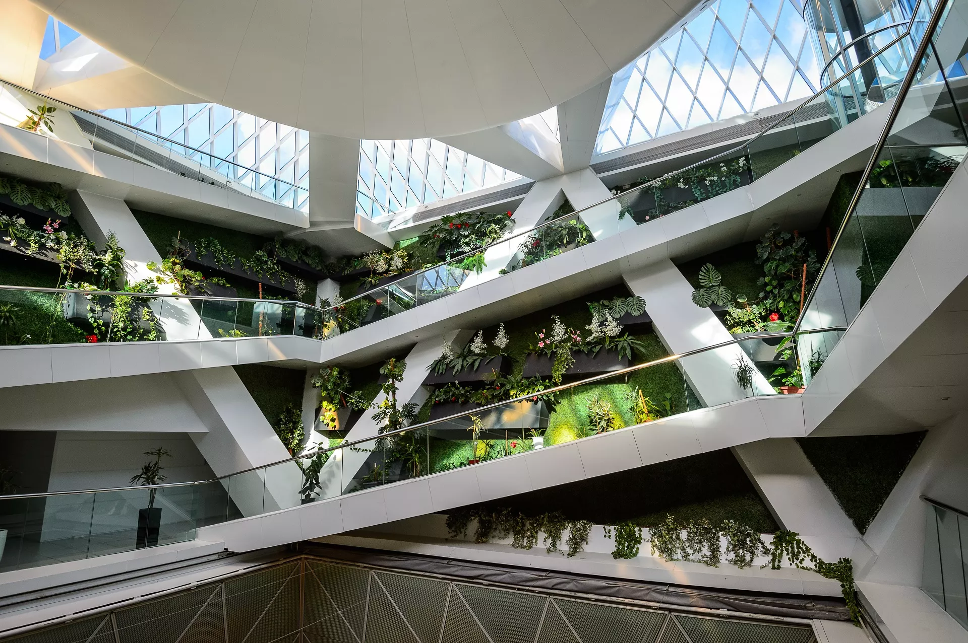 Это здание воплощение города будущего, способного поддерживать комфортные условия для жизни, вне зависимости от погодных условий, благодаря специальному химическому покрытию полотна, защищающему пространство шатра от температурных колебаний. Шатер как бы символизирует щит, изолирующий город от негативного воздействия окружающей среды.