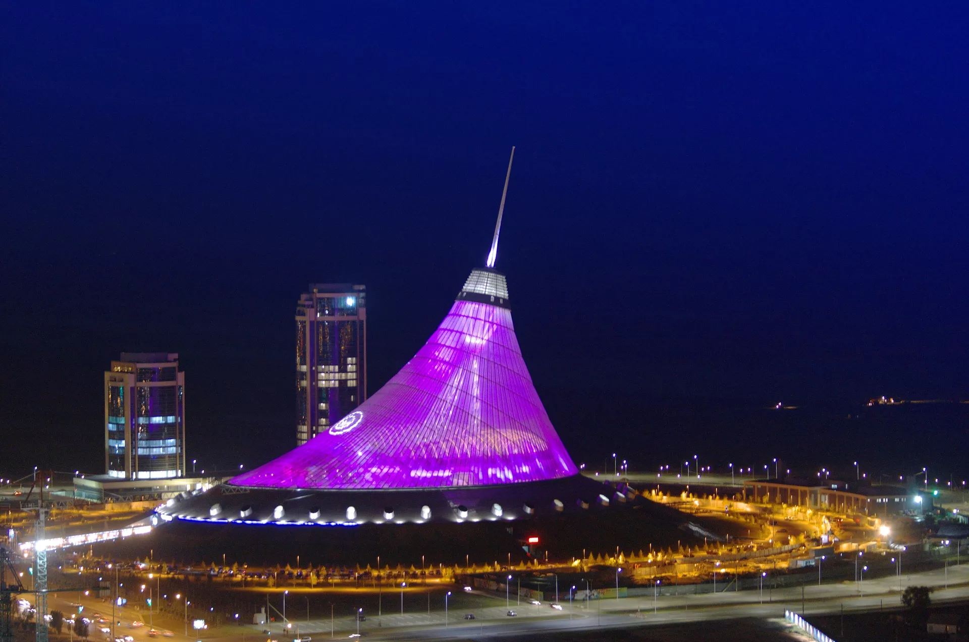 Форма здания выполнено в виде шатра высотой в 150 м. и общей площадью 127 000 кв.м., что является самым крупным в мире и интересным сооружением архитектуры и популярным местом для туристов в городе. А в подтверждение своей уникальности это здание входит в список FORBES, а также является одним из лучших экологически чистых зданий в мире. Строительство здания было выполнено по проекту известного английского архитектора Н. Фостера в 2010 г, который является автором множества архитектурных сооружений Нур-Султана.
