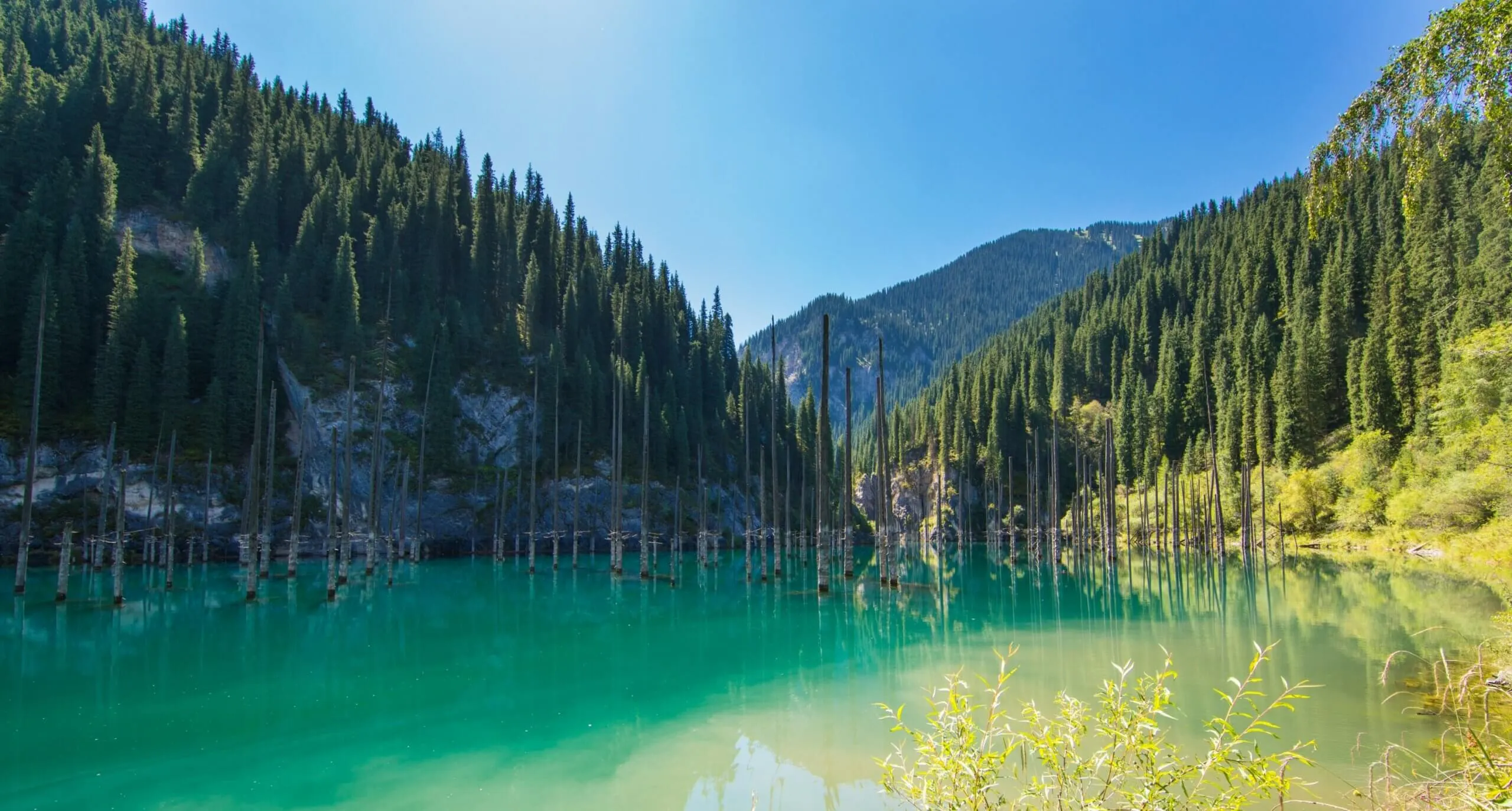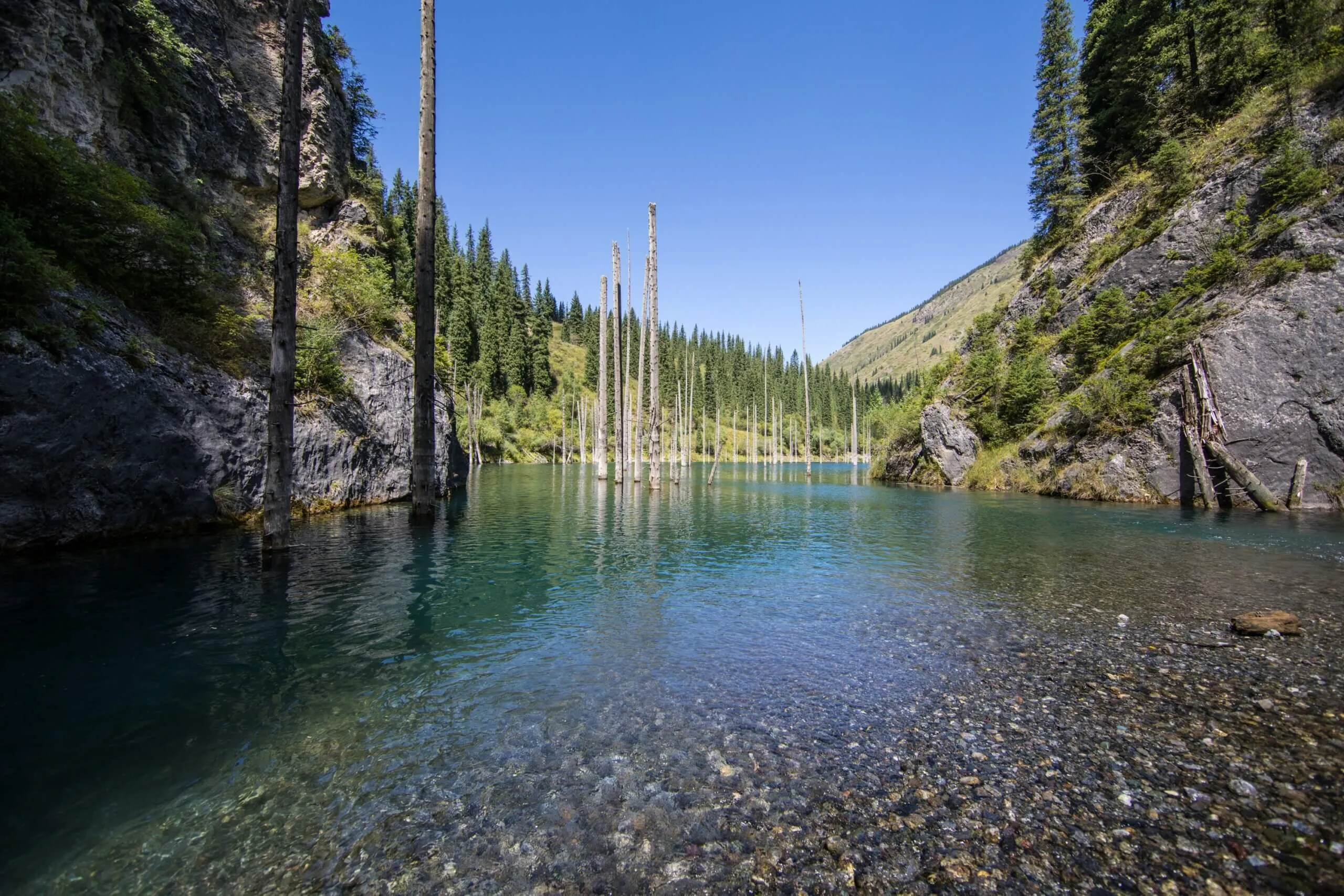 Озеро Каинды отличается от других своей историей и молодостью. По геологическим меркам Каинды вообще еще очень молодой объект. Образовалось оно совсем недавно, в начале XX века. В 1911 году город Верный и его окрестности тряхнуло сильнейшее землетрясение, а в ущелье Каинды произошел тектонический обвал. Проще говоря, на речке Каинды, которая протекала по одноименному ущелью, в один момент образовалась немаленькая запруда. Вода залила часть ущелья, успокоилась, и спустя какое-то время на месте гигантской запруды получилось прекрасное озеро с затопленным лесом внутри.